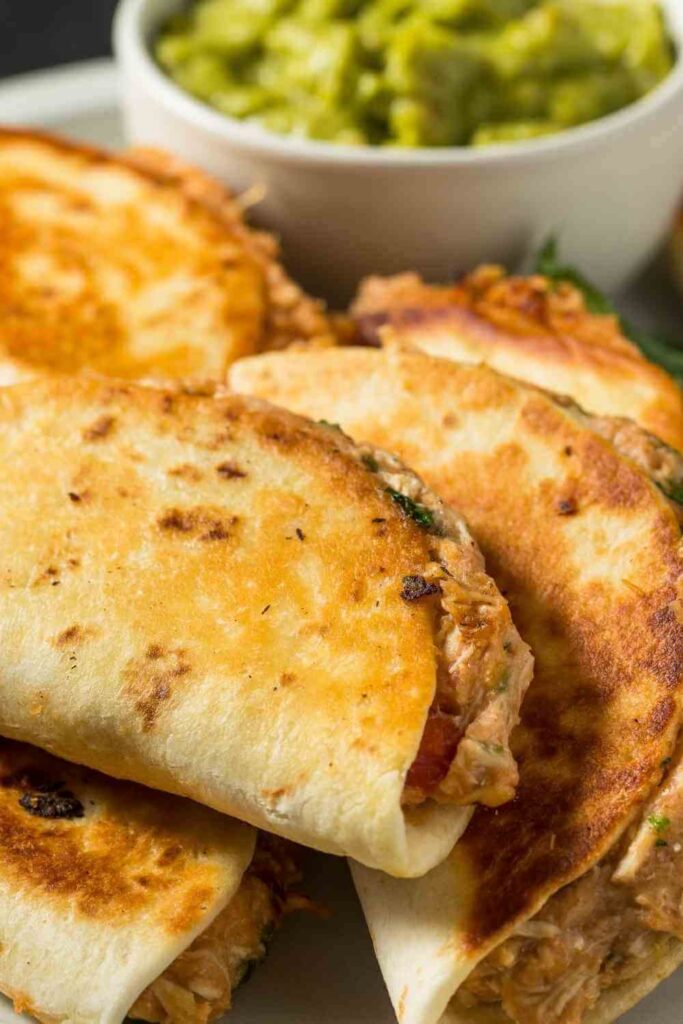 - Slice and Serve: Remove the cooked quesadilla from the skillet and place it on a cutting board. Let it rest for a minute before slicing it into four wedges, like a pizza. Repeat the cooking process with the remaining quesadillas, adding more butter or oil to the pan as needed. Arrange the wedges on a platter and serve immediately with bowls of salsa, sour cream, and guacamole for dipping.