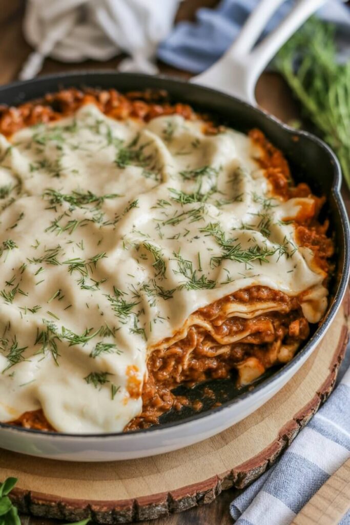 2. Chicken Stroganoff Skillet Lasagna: Use ground chicken or chopped cooked chicken thighs. Replace beef broth with chicken broth, keep Dijon + Worcestershire, and add extra paprika. The flavor becomes lighter while staying creamy and cozy.