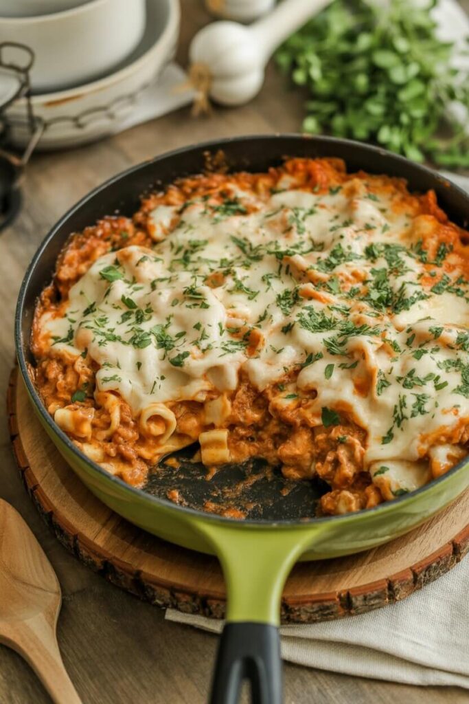 If you bake it, remember the sauce tightens as it cools, so it’s better to stop baking when it’s just bubbly rather than letting it dry out. Resting is not optional here it’s how you get that cozy, thick, lasagna-like scoop.