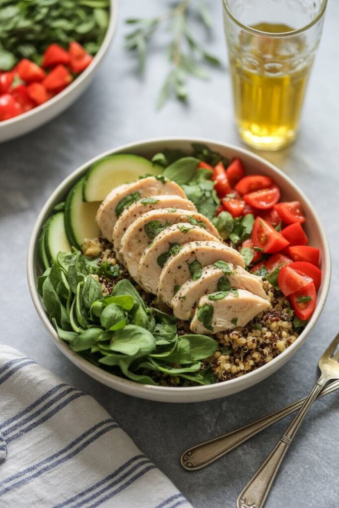 This vibrant bowl is a powerhouse of nutrition and Mediterranean flavor. The combination of fluffy quinoa, savory chicken, crisp cucumbers, juicy tomatoes, and salty feta creates a satisfying meal that is both light and filling. Drizzled with a simple lemon-herb vinaigrette, this dish is bright, fresh, and perfect for a healthy lunch or dinner. It’s also highly customizable and an excellent choice for meal prepping, as the components can be stored separately and assembled just before serving.
